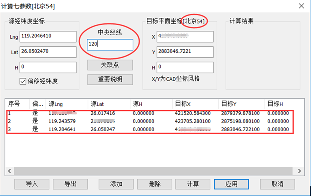 在開(kāi)始計(jì)算7參數(shù)之前,請(qǐng)確認(rèn)你已獲知平面坐標(biāo)中的坐標(biāo)類型(北京54/西安80/國(guó)家2000),以及平面坐標(biāo)中所采用的中央經(jīng)線。