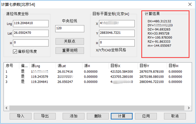注意選擇正確的坐標(biāo)類型,添加至少3個(gè)關(guān)聯(lián)點(diǎn),就可以開(kāi)始計(jì)算7參數(shù)。