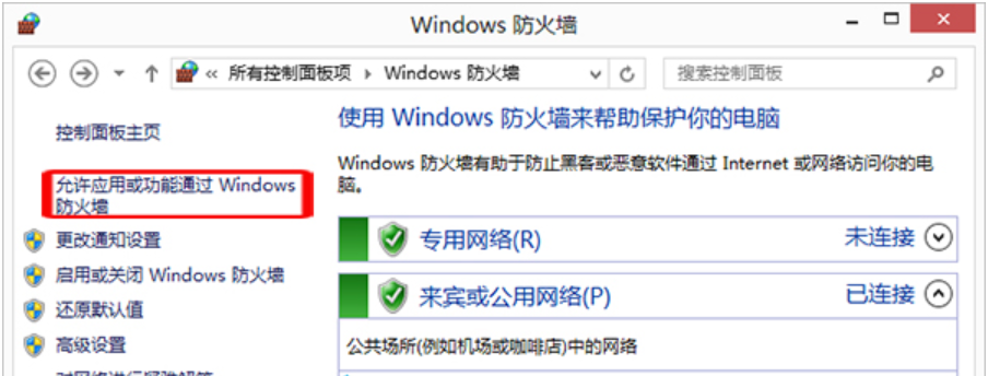 2、可以看到防火墻是開啟狀態(tài),點(diǎn)擊“允許應(yīng)用或功能通過Windows防火墻”將奧維企業(yè)服務(wù)器應(yīng)用程序添加到允許通過防火墻的列表