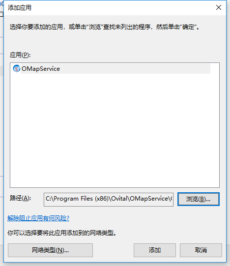 4、在下圖中點(diǎn)擊“瀏覽”來定位奧維服務(wù)器應(yīng)用程序,默認(rèn)安裝路徑是C:\Program Files (x86)\Ovital\OMapService,定位后點(diǎn)擊“添加”。