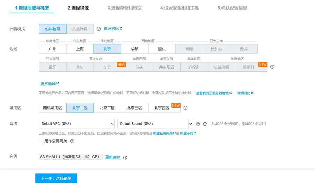 進(jìn)入[自定義配置型]頁面,點(diǎn)擊【選擇地域與機(jī)型】,選擇計(jì)費(fèi)模式、地域、可用區(qū)、網(wǎng)絡(luò)(選擇默認(rèn)設(shè)設(shè)置即可)。關(guān)于地域選擇,用戶所在是哪個(gè)就選擇哪個(gè)。