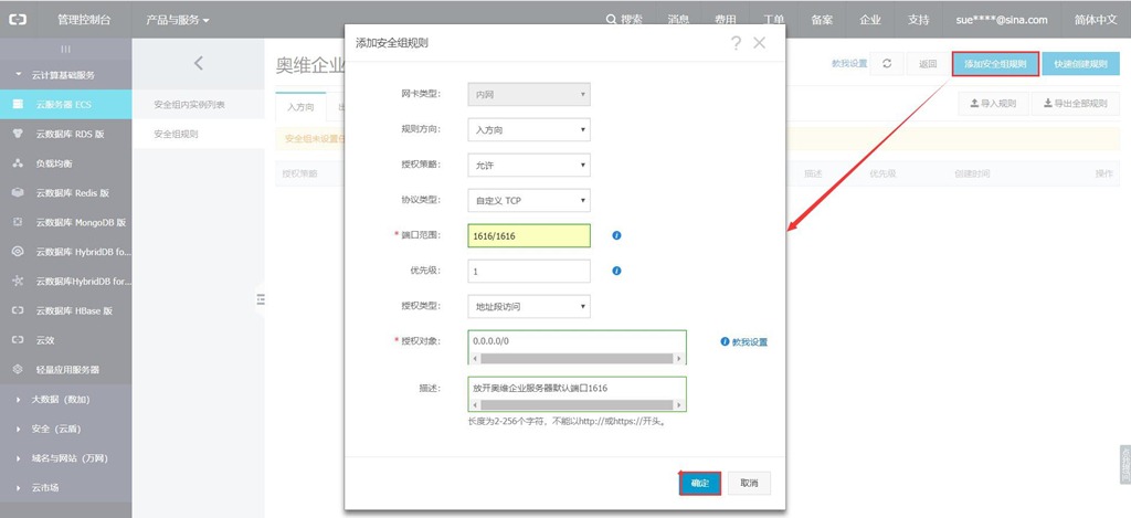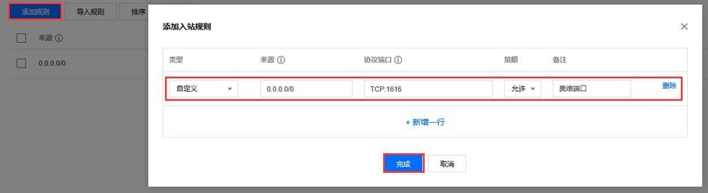 在安全組中需要添加端口規(guī)則,這里需要添加的安全組有奧維企業(yè)版服務(wù)器端口號(hào),默認(rèn)端口號(hào)是1616,如需更改請?jiān)谏蟼€(gè)步驟進(jìn)行,還需放開Windows或Linux遠(yuǎn)程登陸此云服務(wù)器進(jìn)行部署的3389端口。