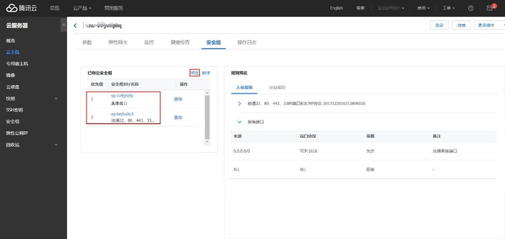 3、設(shè)置好安全組規(guī)則后為云主機(jī)綁定以上安全組,點(diǎn)擊【安全組】,點(diǎn)擊【綁定】,為云主機(jī)綁定安全組,下圖是綁定了安全組的狀態(tài)。