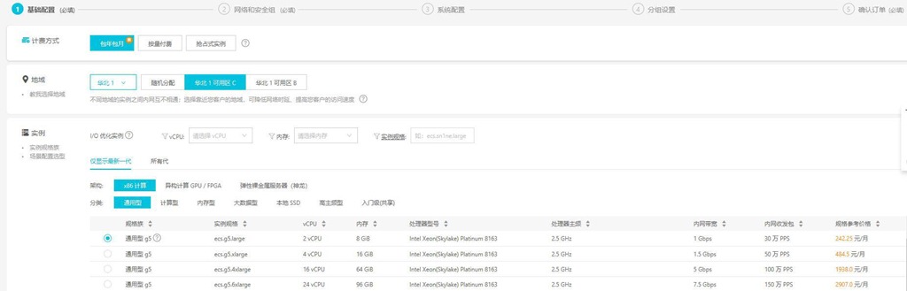在[自定義購買]頁面,進(jìn)行基本配置。選擇計(jì)費(fèi)方式、地域、實(shí)例等,如下圖所示。