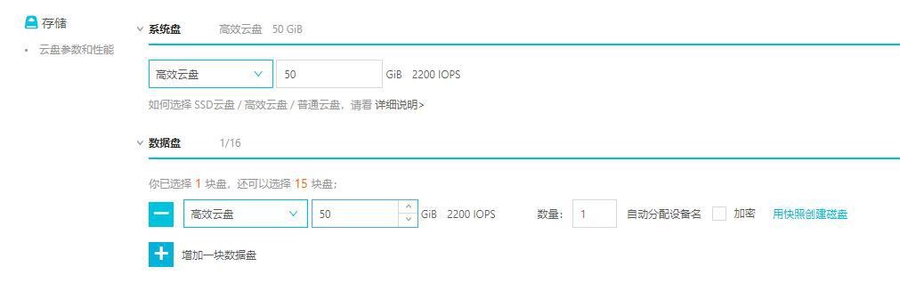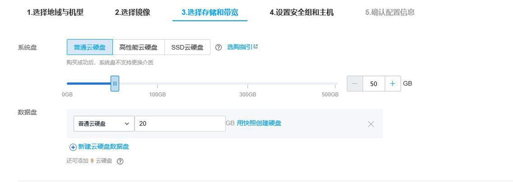 切換到[選擇存儲(chǔ)與帶寬]頁面,選擇系統(tǒng)盤、數(shù)據(jù)盤,如下圖所示。用戶可根據(jù)實(shí)際需要決定是否添加數(shù)據(jù)盤。