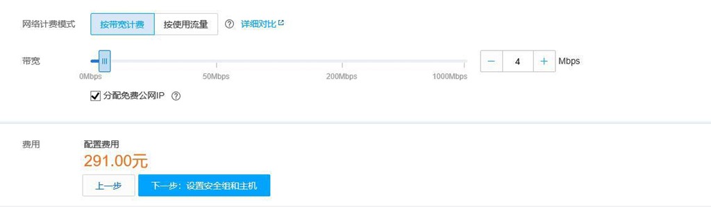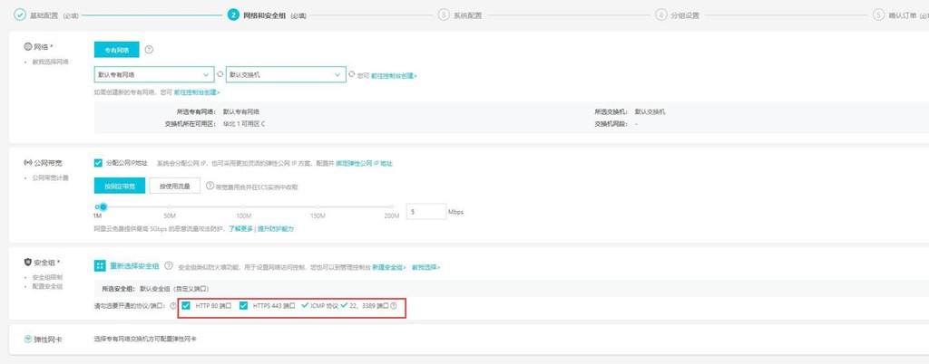 進(jìn)入[網(wǎng)絡(luò)和安全組]頁面,設(shè)置網(wǎng)絡(luò)、公網(wǎng)帶寬、安全組。