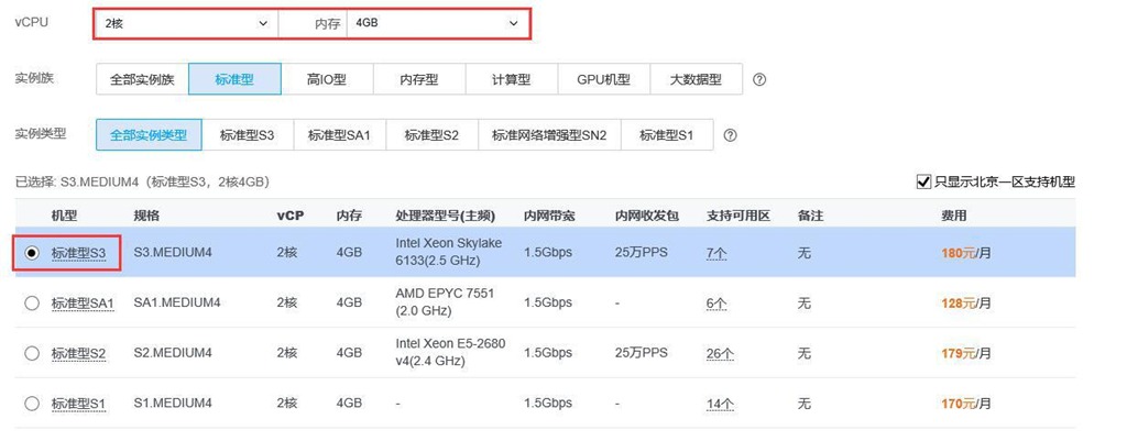 選擇實(shí)例,點(diǎn)擊【重新選擇】,進(jìn)入實(shí)例選擇頁面,此處以標(biāo)準(zhǔn)型S3、CPU2核、內(nèi)存4G為例(最低配置要求),如下圖,選擇后,點(diǎn)擊【確定】按鈕。用戶根據(jù)實(shí)際需要選擇,建議用戶選擇配置更高的。