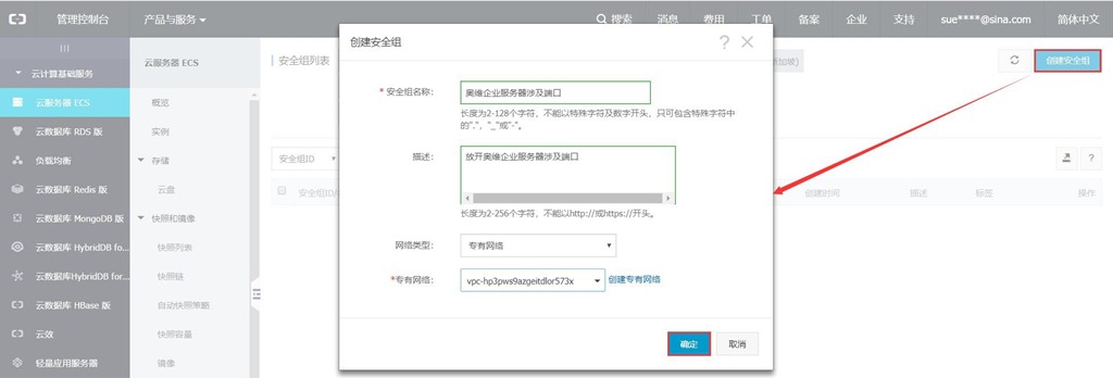 點(diǎn)擊【創(chuàng)建安全組】,彈出[創(chuàng)建安全組]頁面,填寫安全組名稱,選擇網(wǎng)絡(luò)類型【專有網(wǎng)絡(luò)】,點(diǎn)擊【確定】按鈕。