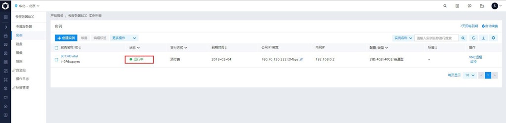 選購成功幾分鐘后,在控制臺(tái)的【云服務(wù)器BCC/實(shí)例】中可以看到剛剛采購的云服務(wù)器已處于運(yùn)行中,現(xiàn)在可以進(jìn)行配置了。