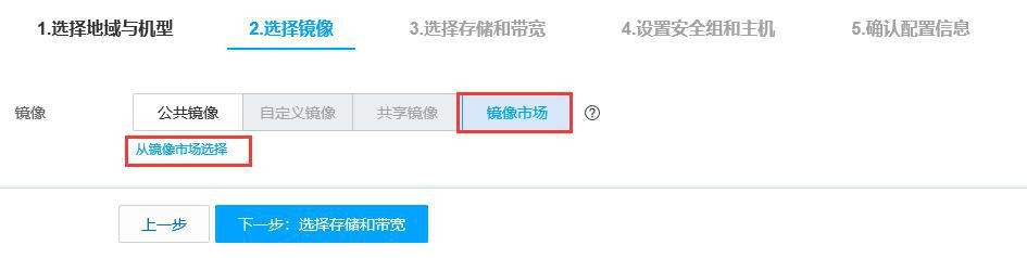 點(diǎn)擊【下一步:選擇鏡像】,切換到[選擇鏡像]頁面,點(diǎn)擊【從服務(wù)市場選擇】。