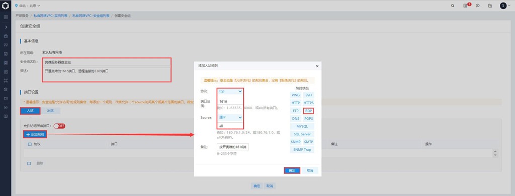 端口設(shè)置:點(diǎn)擊【入站】,點(diǎn)擊【新建規(guī)則】,彈出[添加入站規(guī)則]頁面,設(shè)置協(xié)議、端口范圍、Source等信息,點(diǎn)擊【確定】按鈕,如下圖。添加完1616端口后,再添加3389端口。