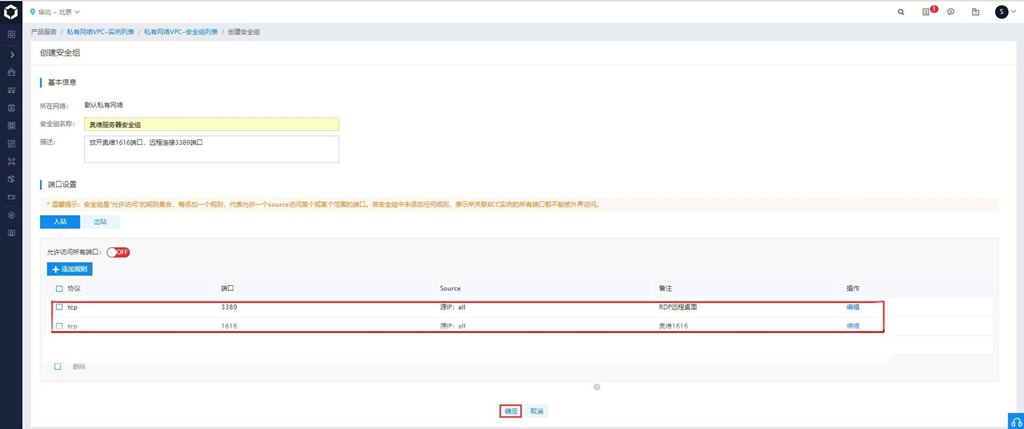 添加完1616端口后,再添加3389端口,安全組設(shè)置如下圖所示,點(diǎn)擊【確定】按鈕。