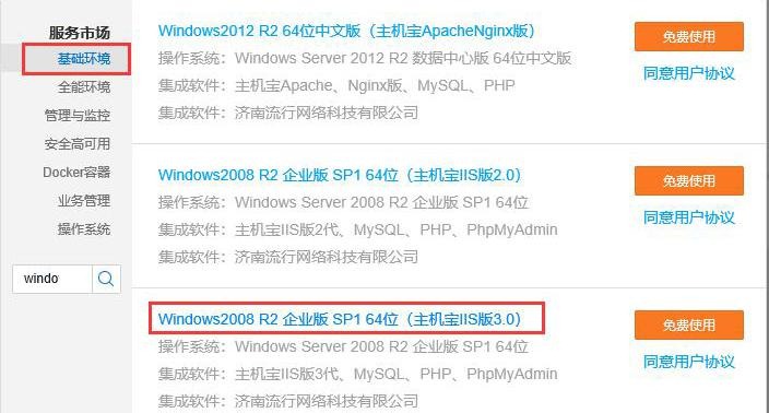 在【基礎(chǔ)環(huán)境】欄中選擇操作系統(tǒng),搜索Windows,可選擇這個(gè)帶有MYSQL安裝環(huán)境的Windows 2008 R2企業(yè)版,如下圖,點(diǎn)擊【免費(fèi)使用】。選擇完成后,點(diǎn)擊【下一步:選擇存儲(chǔ)與網(wǎng)絡(luò)】。