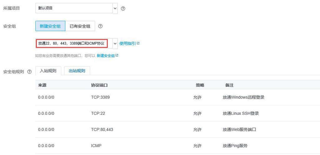 進(jìn)入[設(shè)置安全組和主機(jī)]頁面,選擇【新建安全組】,選擇放通22/80/443/3389端口和ICMP協(xié)議。