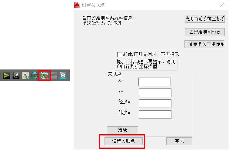 設(shè)置關(guān)聯(lián)點(diǎn):即建立CAD文件某點(diǎn)的平面坐標(biāo)與經(jīng)緯度坐標(biāo)的對(duì)應(yīng)關(guān)系。