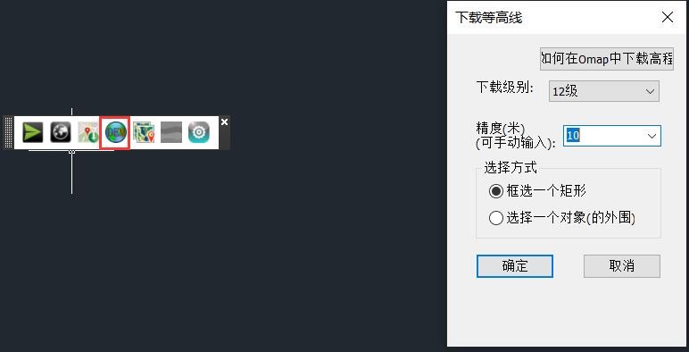 選擇方式:框選一個(gè)矩形,即按照用戶框選的矩形區(qū)域下載等高線數(shù)據(jù);選擇一個(gè)對(duì)象,即以某個(gè)對(duì)象為中心,下載周邊的等高線數(shù)據(jù)。本文以【框選一個(gè)矩形】為例。