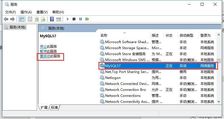 打開控制面板——管理工具——服務(wù),選中MySQL57,點擊【重啟動】,即可。