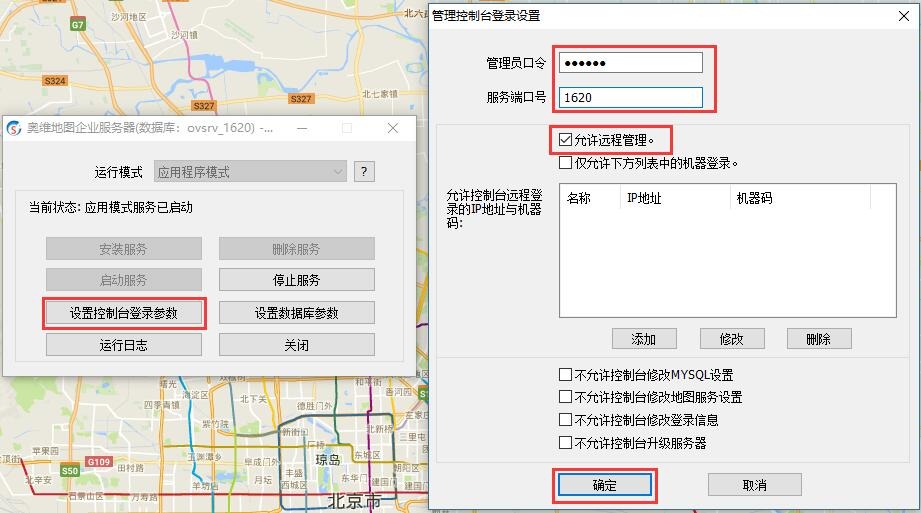 點擊【設(shè)置控制臺登錄參數(shù)】按鈕,進入【管理控制臺登錄設(shè)置】窗口,設(shè)置管理員口令、端口號,勾選【允許遠程管理】等,點擊【確定】按鈕,點擊【停止服務(wù)】按鈕,停止服務(wù),點擊【啟動服務(wù)】按鈕,重新啟動奧維應(yīng)用模式服務(wù)。