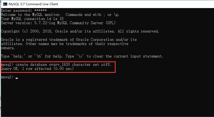 啟動MySQL 5.7 Command Line Client,登錄數(shù)據(jù)庫,創(chuàng)建新數(shù)據(jù)庫,此處以創(chuàng)建ovsrv_1620數(shù)據(jù)庫為例。