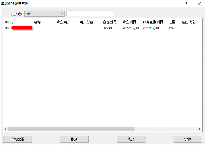 在顯示的奧維GPS定位設(shè)備列表中,顯示設(shè)備的IMEI編號、名稱(設(shè)置名稱后才會顯示)、綁定用戶(綁定后才會顯示)、設(shè)備型號、綁定時間、服務(wù)到期時間、電量、在線狀態(tài)、最后連接時間、最后定位時間、經(jīng)緯度等信息。