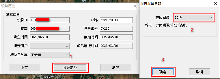 在【設(shè)備屬性】窗口中,點(diǎn)擊【設(shè)備參數(shù)】按鈕,彈出【設(shè)置設(shè)備參數(shù)】窗口,可對設(shè)備的定位間隔進(jìn)行設(shè)置。