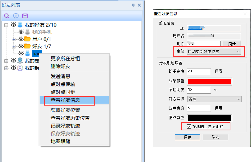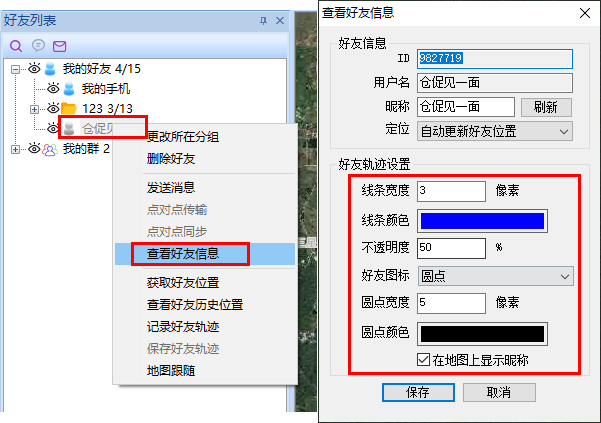 在[好友列表]窗口中,選中好友,點(diǎn)擊【右鍵】,點(diǎn)擊【查看好友信息】按鈕,進(jìn)入[查看好友信息]窗口,在【好友軌跡設(shè)置】欄中,可對(duì)線條顏色、線條寬度、不透明度、好友圖標(biāo)、顯示昵稱等進(jìn)行設(shè)置。