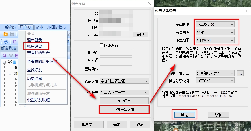 登錄賬戶后,點(diǎn)擊[用戶]菜單,點(diǎn)擊【賬戶設(shè)置】,點(diǎn)擊【位置采集設(shè)置】,設(shè)置定位收集、采集間隔、存盤期限等。