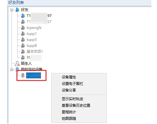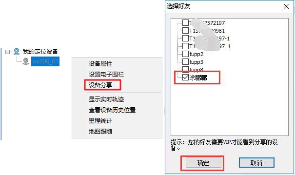 在[我的定位設(shè)備]列表下,選中需要分享給好友的設(shè)備,點(diǎn)擊鼠標(biāo)右鍵,點(diǎn)擊【設(shè)備分享】按鈕,彈出[選擇好友]窗口,勾選用戶B,點(diǎn)擊【確定】按鈕,即可完成分享。