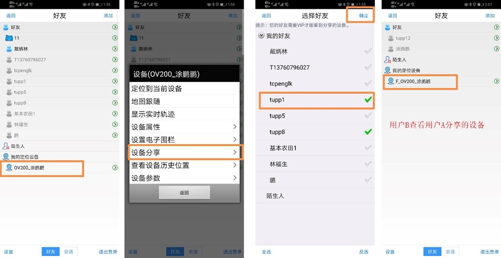 用戶A操作:在[好友]頁(yè)面中,點(diǎn)擊定位設(shè)備,點(diǎn)擊【設(shè)備分享】,勾選好友,點(diǎn)擊【確定】,即可。