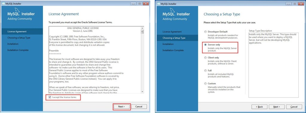 (1)運行mysql-installer-community-5.7.22.1.msi,進入安裝界面,勾選【I accept the license terms】,點擊【Next(下一步)】按鈕,選擇【Server only】,點擊【Next(下一步)】按鈕。