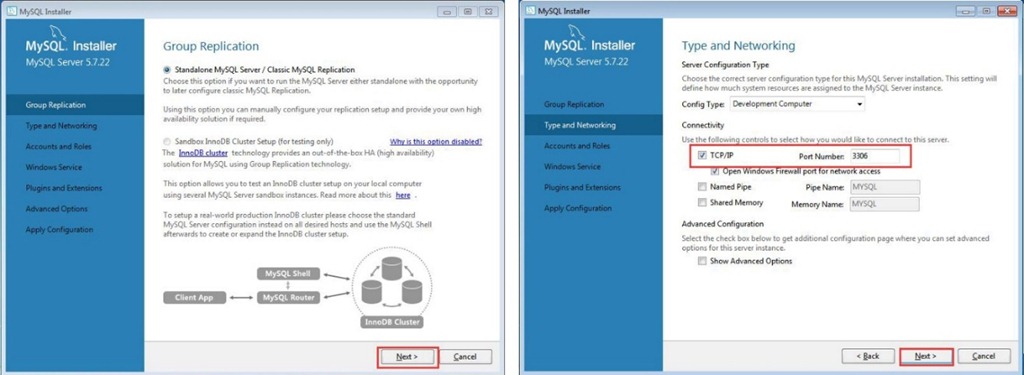 (5)配置Group Replication(組復制),保持默認設置即可,點擊【Next(下一步)】按鈕;配置Type and Networking(類型與組網(wǎng)),保持默認設置即可,點擊【Next(下一步)】按鈕。