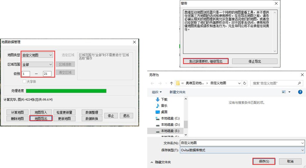 在[地圖數(shù)據(jù)管理]窗口中,設(shè)置地圖類型、區(qū)域范圍、級(jí)別等,點(diǎn)擊【導(dǎo)出】按鈕。彈出相關(guān)提示,點(diǎn)擊【我已獲得授權(quán),繼續(xù)導(dǎo)出】,輸入文件名稱,點(diǎn)擊【保存】按鈕,即可。