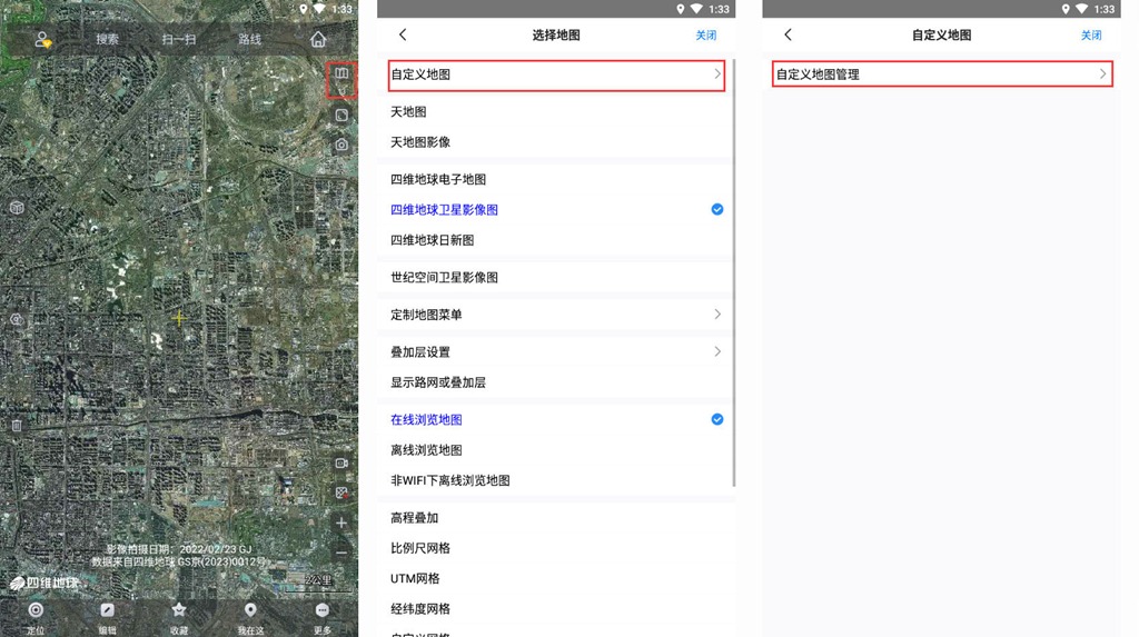 啟動(dòng)奧維Android/iOS版,點(diǎn)擊主界面右上角的圖片1按鈕,點(diǎn)擊【自定義地圖】,點(diǎn)擊【自定義地圖管理】,進(jìn)入[自定義地圖管理]頁面。