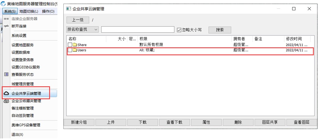 在管理控制臺PC端中,點擊[系統(tǒng)]菜單,點擊【企業(yè)共享云端管理】,這里有兩個根文件夾,Share和Users,通常將二維碼存放在Users文件夾下。當然,用戶也可以創(chuàng)建一個單獨的文件夾。