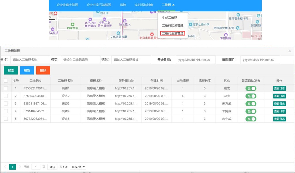 在此,管理員可對所有二維碼進行管理,如搜索、刪除、查看日志等。