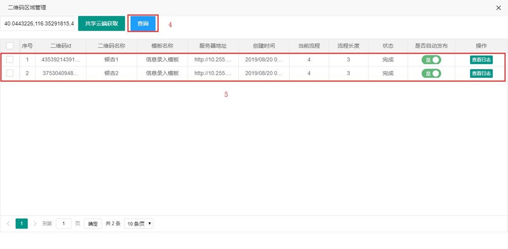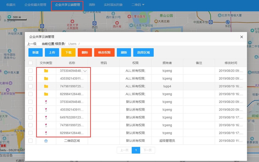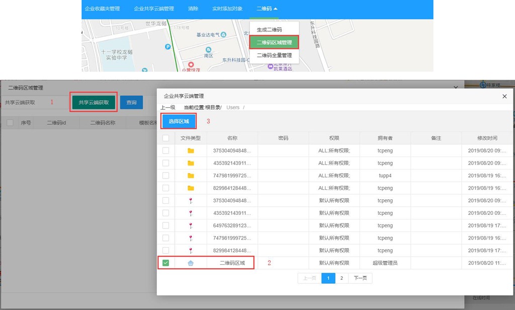 在[二維碼區(qū)域管理]頁面,點擊【共享云端獲取】,彈出[企業(yè)共享云端管理]頁面;進入存放區(qū)域的文件夾下,勾選區(qū)域,點擊【選擇區(qū)域】,點擊【查詢】,即可搜索出該區(qū)域內(nèi)的所有二維碼信息。