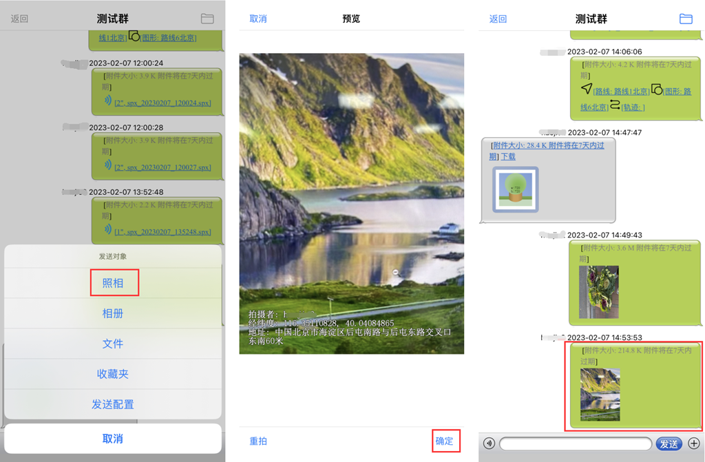 群成員可將手機相冊中照片發(fā)送到群中,也可直接拍攝照片發(fā)送。