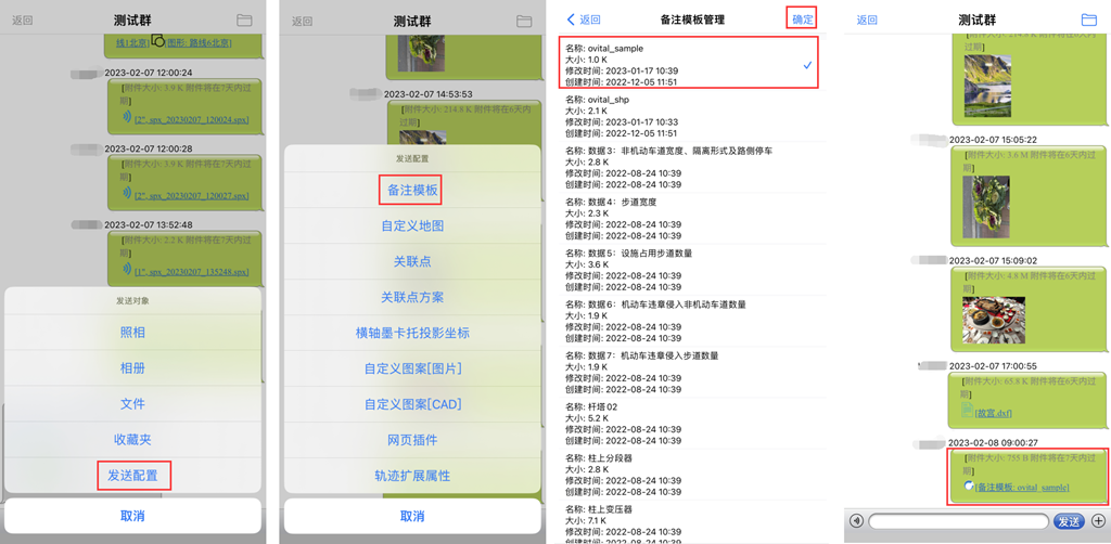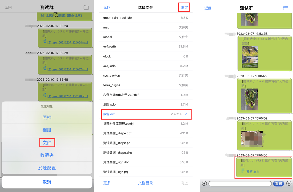 除了可以在群中發(fā)送奧維的標(biāo)簽、軌跡、圖形、導(dǎo)航路線等數(shù)據(jù)外,還可以發(fā)送手機拍攝的照片以及存儲的文件。
