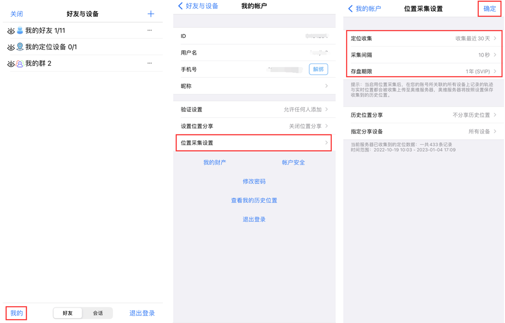 登錄賬戶后,在[好友]頁面,點擊【設(shè)置】,點擊【位置采集設(shè)置】,設(shè)置定位收集、采集間隔、存盤期限等。