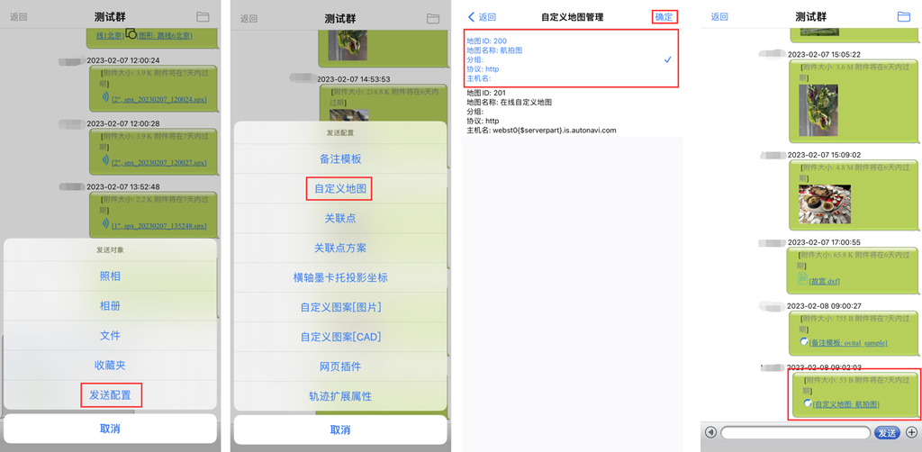 點擊[+],在[發(fā)送對象]頁面,點擊[發(fā)送配置]→[自定義地圖],系統(tǒng)自動進入自定義地圖管理頁面,選擇需要發(fā)送的自定義地圖,點擊[選擇]即可。