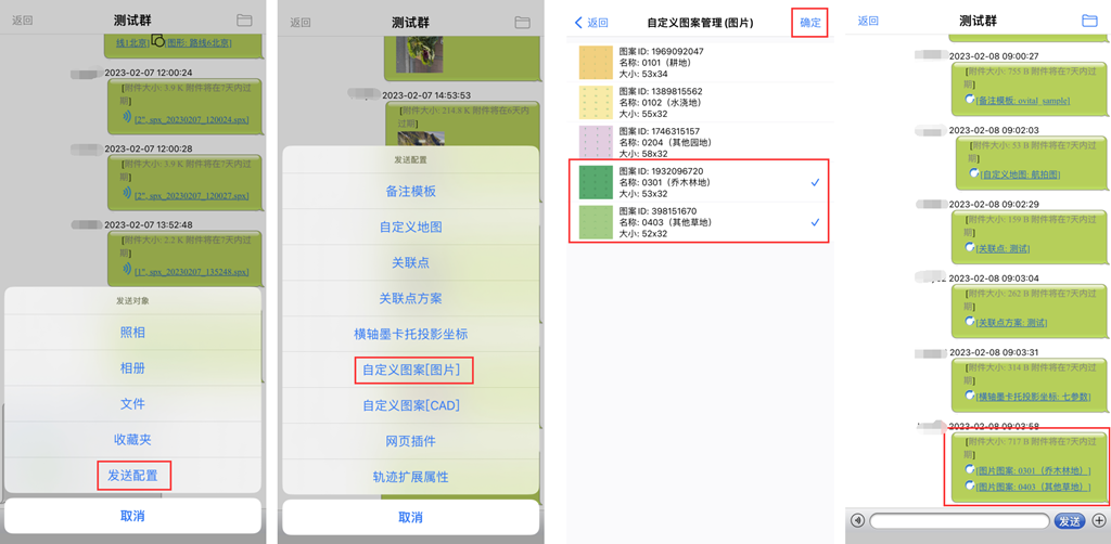 點擊[+],在[發(fā)送對象]頁面,點擊[發(fā)送配置]→[自定義圖案(圖片)],系統(tǒng)自動進入自定義圖案(圖片)管理頁面,選擇需要發(fā)送的自定義圖案(圖片),點擊[選擇]即可。