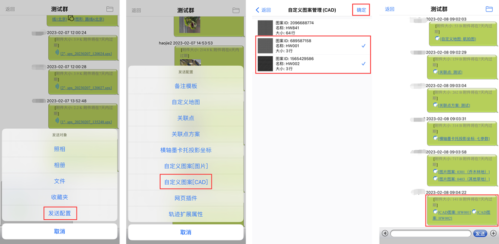 點擊[+],在[發(fā)送對象]頁面,點擊[發(fā)送配置]→[自定義圖案(CAD)],系統(tǒng)自動進入自定義圖案(CAD)管理頁面,選擇需要發(fā)送的自定義圖案(CAD),點擊[選擇]即可。