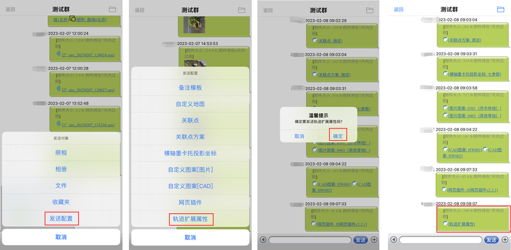 點擊[+],在[發(fā)送對象]頁面,點擊[發(fā)送配置]→[軌跡擴展屬性],系統(tǒng)提示是否確定分享,點擊[確定]即可。