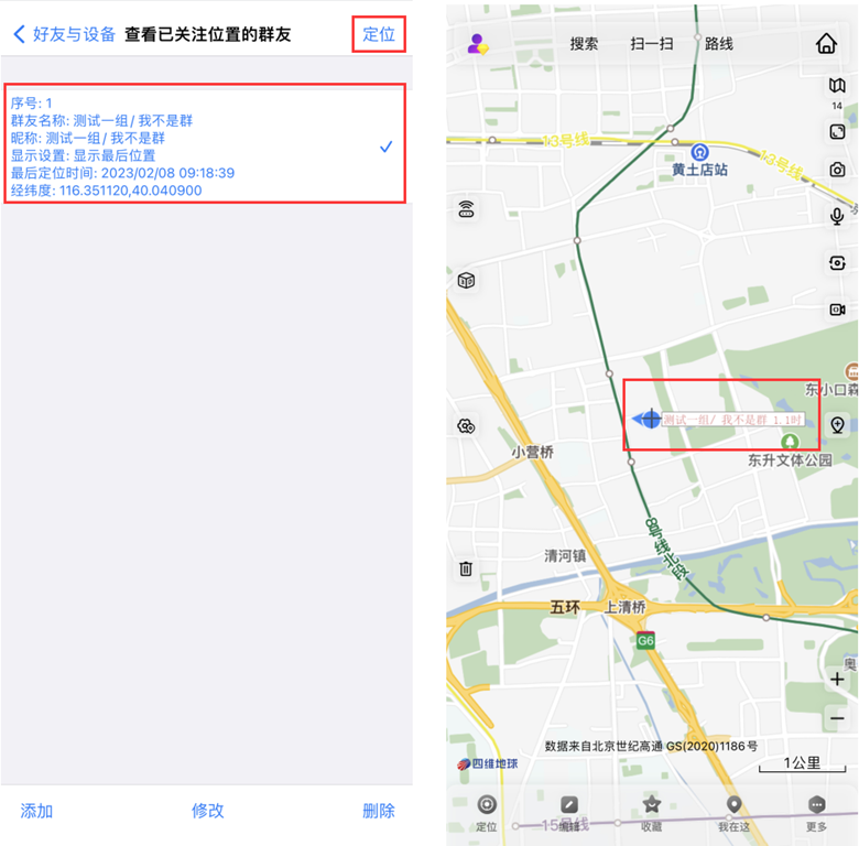 添加后,待群友A產(chǎn)生了定位信息,群友B可在此看到群友A的最后定位時間、經(jīng)緯度信息,勾選群友A,點擊【定位】,即可在地圖上定位出群友A的位置。