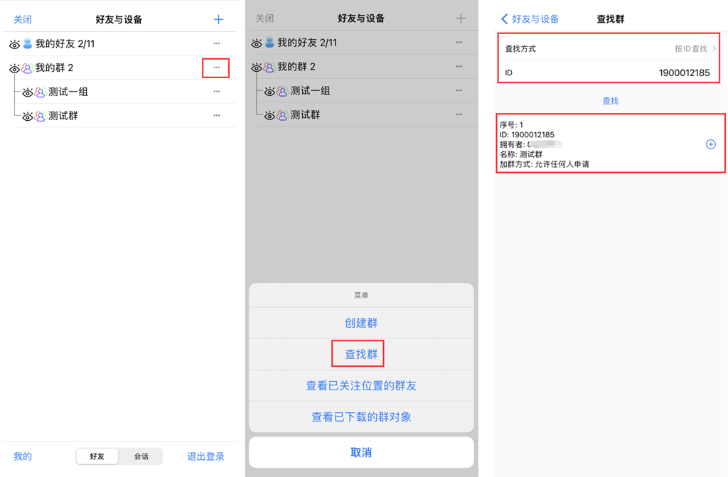 在[好友]頁面,點擊[我的群]右側(cè)的1按鈕,彈出[菜單]頁面;點擊【查找群】,選擇查找方式(包括按ID查找或者按名稱查找),輸入ID或者名稱,點擊【查找】按鈕,即可。