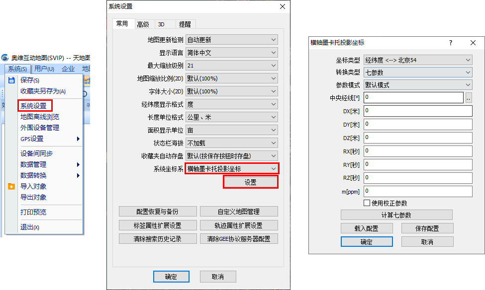 在奧維互動地圖PC版客戶端中,點(diǎn)擊[系統(tǒng)]菜單,點(diǎn)擊【系統(tǒng)設(shè)置】,進(jìn)入[系統(tǒng)設(shè)置]窗口;在[常用]選項卡中,點(diǎn)擊【系統(tǒng)坐標(biāo)系】下拉框,選擇【橫軸墨卡托投影坐標(biāo)】,點(diǎn)擊【設(shè)置】按鈕,進(jìn)入[橫軸墨卡托投影坐標(biāo)]設(shè)置窗口。用戶即可設(shè)置需要的坐標(biāo)系。
