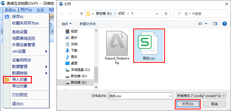 在奧維電腦端,點(diǎn)擊[系統(tǒng)]菜單,點(diǎn)擊【導(dǎo)入對象】,選擇需要導(dǎo)入的文件,點(diǎn)擊【打開】。