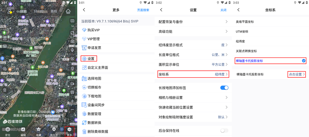 在奧維手機(jī)端主界面,點(diǎn)擊【更多】按鈕,進(jìn)入點(diǎn)擊【設(shè)置】按鈕,點(diǎn)擊【坐標(biāo)系】,進(jìn)入[坐標(biāo)系]頁面,用戶可在此設(shè)置系統(tǒng)坐標(biāo)系。