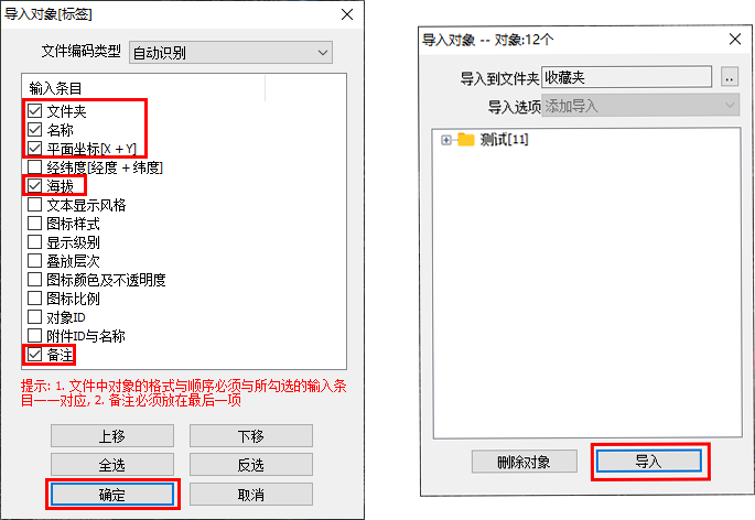 (2)其他屬性的排列順序可以改變,如可以為x坐標(biāo)、y坐標(biāo)、名稱、海拔;執(zhí)行導(dǎo)入時,需要設(shè)置輸入條目,輸入條目的順序必須和文件中屬性的順序保持一致。