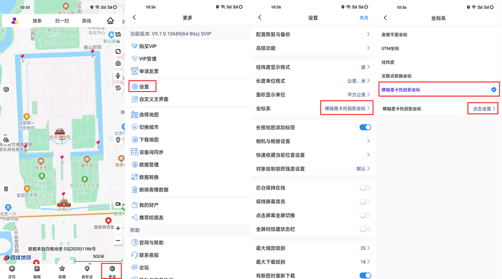 在手機(jī)端主界面,點(diǎn)擊【更多】,點(diǎn)擊【設(shè)置】,點(diǎn)擊【坐標(biāo)系】,選擇【橫軸墨卡托投影坐標(biāo)】,點(diǎn)擊設(shè)置,進(jìn)入[橫軸墨卡托投影坐標(biāo)]頁(yè)面。